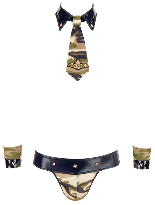Yes, Sir! Yhdysvaltojen armeijahenkinen miesten setti. Sopii hyvin miesstrippareille, polttareihin tai kun haluat yllättää kumppanisi! Ota komento käsiisi, määräyksiä on toteltava ilman pullikointia! Setissä stringit, kaulus ja lyhyt solmio, kalvosimet ja armeijatyylinen baretti US Army -tekstillä. Kaulus/solmio ja kalvosimet mustaa wetlook-materiaalia ja maastokuvioitua kangasta, painonepparikiinnitys, koristetähdet. Stringit wetlook-materiaalia ja maastokuviokangasta, koristetähdet. Materiaali 90% polyester, 10% elastaani. Yksi koko.