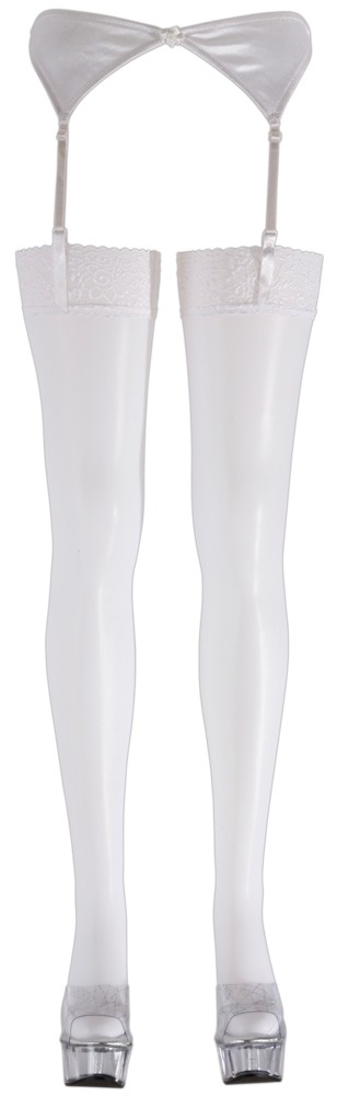 Valkoiset reisipituiset sukat ovat kauniit ja ne sopivat vaikkapa hääpäivän kunniaksi! Sukkien leveä resori on kauniisti kuvioitu. Sukkanauhaliivi myydään erikseen. Materiaali 95% polyamid, 5% elastaani.